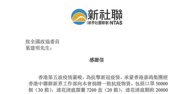 香港第五波疫情嚴峻,為抗擊新冠疫情,承蒙香港嘉鴻集團經香港中聯(lián)辦新界工作部向本會捐贈一批抗疫物資,包括口罩50000個(30箱),蓮花清瘟膠囊7200盒(20箱),蓮花清瘟膠顆粒20000盒(100箱),藿香正氣水18000盒(180箱)。
