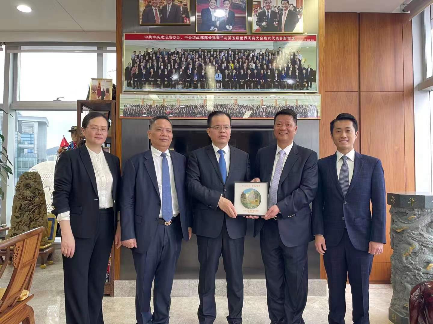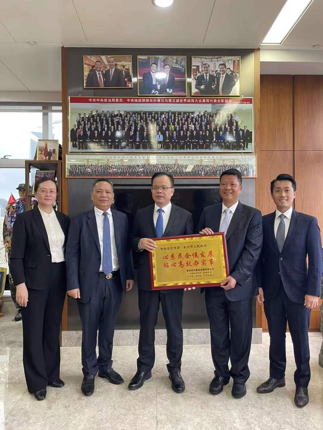 4月22日,泉州市市長(zhǎng)蔡戰(zhàn)勝一行蒞臨嘉鴻集團(tuán)香港總部參觀指導(dǎo)。集團(tuán)董事長(zhǎng)葉建明先生、總經(jīng)理葉華雄陪同。期間,泉州市市長(zhǎng)蔡戰(zhàn)勝(左)代表泉州市委、市政府向嘉鴻集團(tuán)董事長(zhǎng)葉建明先生贈(zèng)送紀(jì)念品,董事長(zhǎng)葉建明先生也向泉州市委、市政府贈(zèng)送了“心系民企促發(fā)展,貼心高效辦實(shí)事”排牌匾。