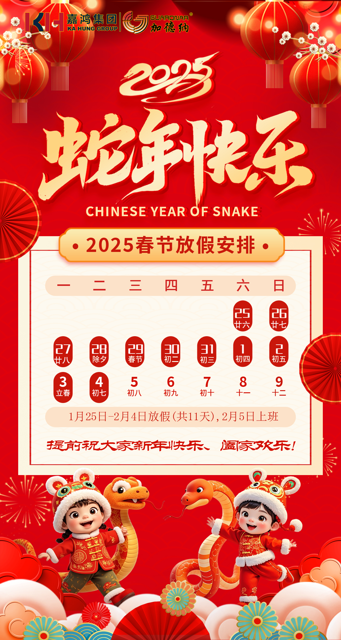 嘉鴻集團(tuán)2025年春節(jié)放假安排的通知