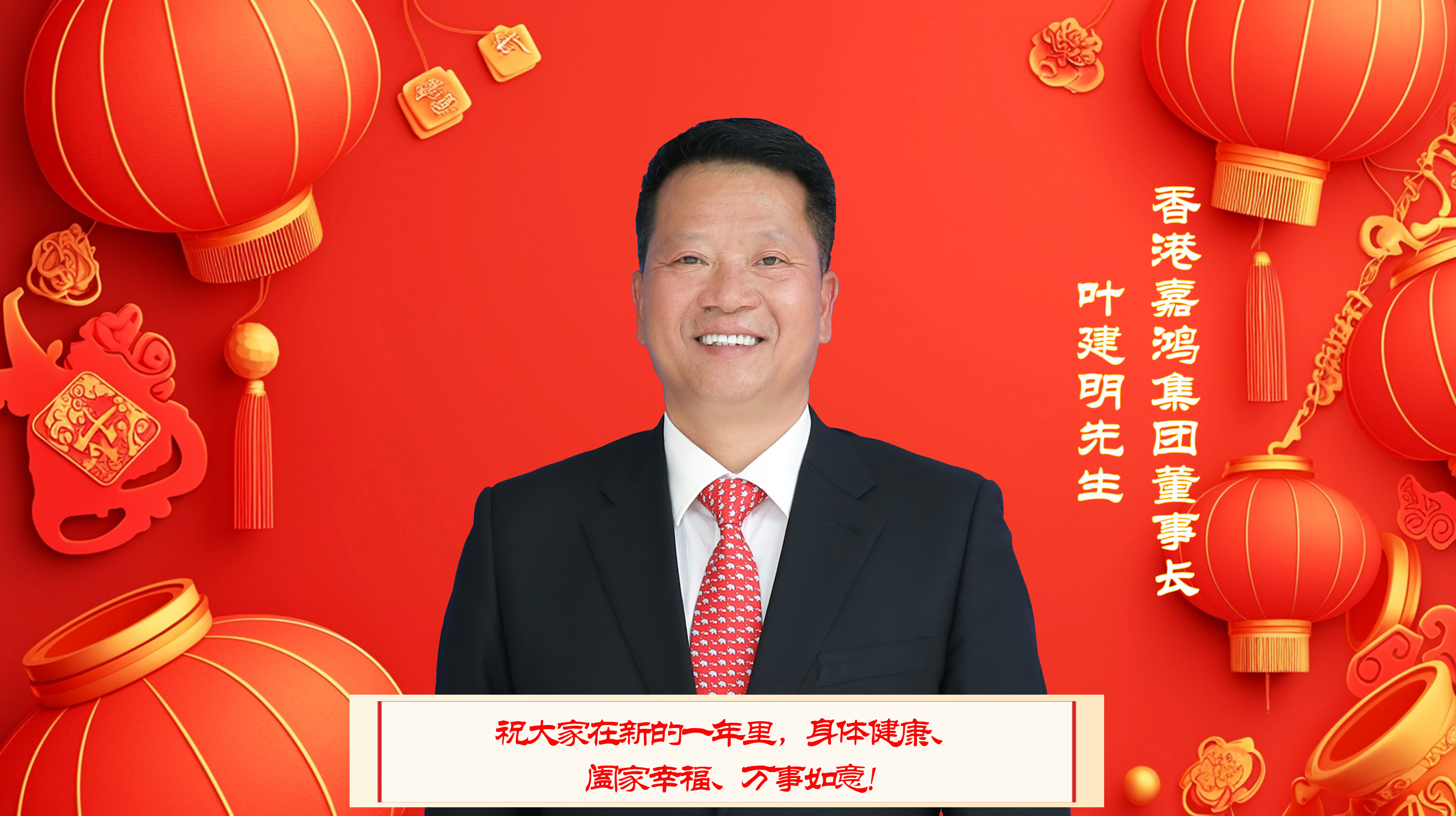 嘉鴻集團(tuán)董事長(zhǎng)葉建明先生攜全體員工向長(zhǎng)期關(guān)心支持嘉鴻集團(tuán)發(fā)展的新老用戶、供應(yīng)商、新老朋友、社會(huì)各界人士致以新春的祝福和誠摯的感謝,祝大家在新的一年里,身體健康、闔家幸福、萬事如意!